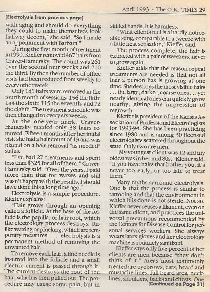 In the 1993 I had a 67-year-old client who had been waxing her upper lip since she was 16. She had been waxing for over 50 years! The center of her upper lip had no hair. The reason she came to me was that the large diameter hairs now growing at the corners of her upper lip were so stubborn she could no long pull them out! My conclusion was that the waxing worked on her center upper lip but made the outside corners of her upper lip worse. This client was willing to contribute to this article in the OLDER KANSAN TIMES.