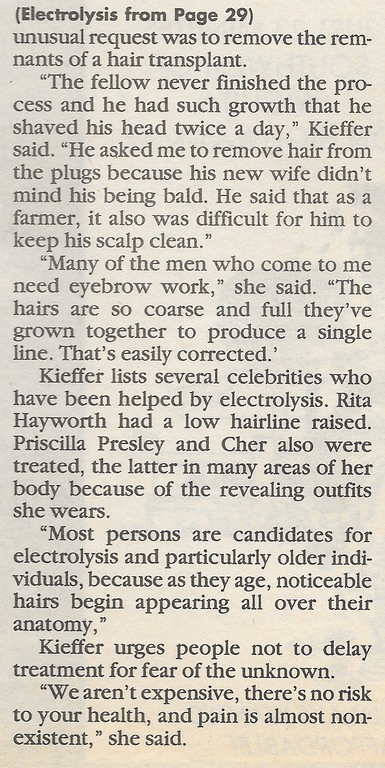 In Fino Gior’s 1987 book MODERN ELECTROLOGY: EXCESS HAIR, ITS CAUSES AND TREATMENTS, we are warned that “follicles can become distorted and thickened from constant tweezing or waxing.” Gior writes, “Ingrown hairs can be another drawback of waxing. This happens when the hair is pulled apart inside the hair follicle. Instead of growing up and out of the follicle, the hair curls under the skin causing a cyst-like projection.”